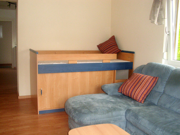- 1 Wohnzimmer mit Schlafcouch (1,20 x 2,20m) und einem Hochbett (1,90m x 0,90m)
